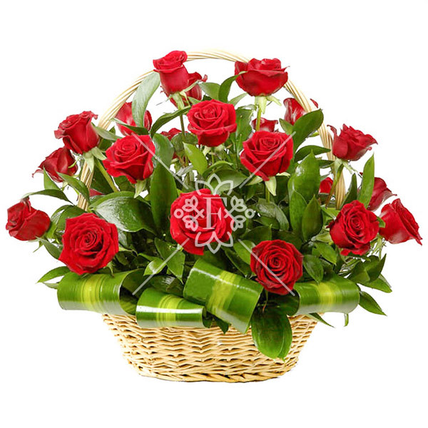 роза красная – 15шт., декоративная зелень, лист аспидистры, оазис, корзина.