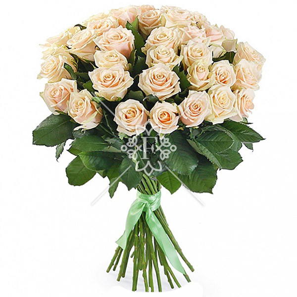 Букет из классических роз кремового оттенка выглядит изысканно, каждый бутон – идеален! Словно драгоценный жемчуг, эта композиция привлекает внимание своей  исключительной нежностью, удивительным цветом и гармонией.